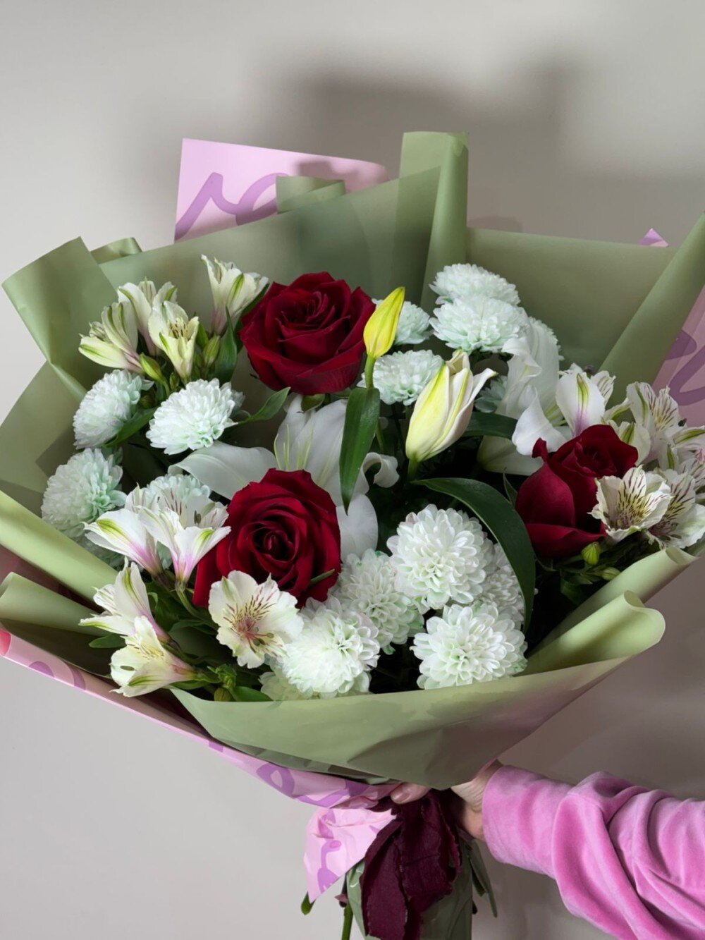 Этот букет отражает наш подход к флористике. Для вашего заказа мы создадим индивидуальную композицию в подобном стиле, учитывая ваши предпочтения и свежесть сезонных цветов. После оформления заказа мы с вами свяжемся для уточнения деталей, а перед отправкой обязательно покажем фото готового букета.